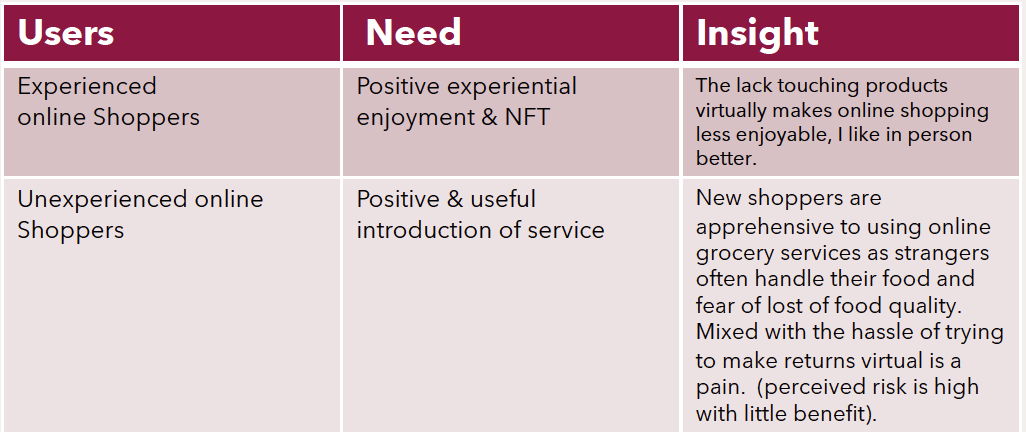 Identify major user needs that inhibits a shopperās experience and attitudes towards online grocery services.