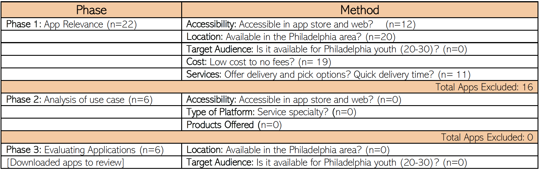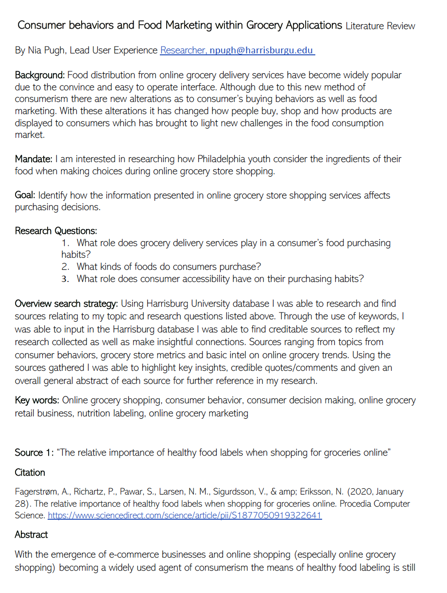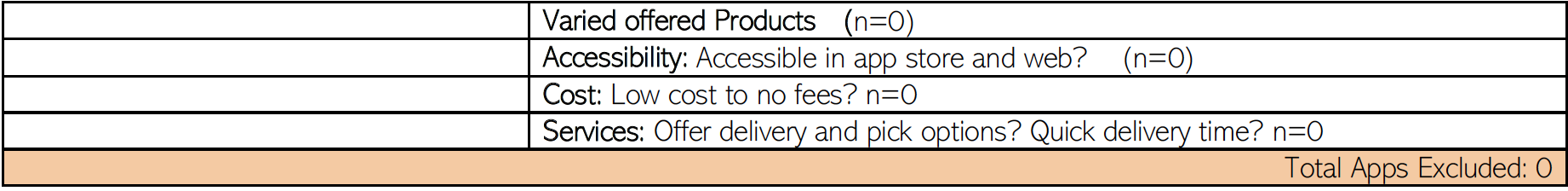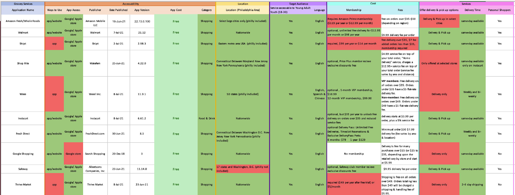 The Prior Art Technology Scoping Review was used to assess market gaps and based on the mandate, user needs and what already exists in the marketplace. I performed a scoping review on current grocery service applications for shoppers in the Philadelphia area.