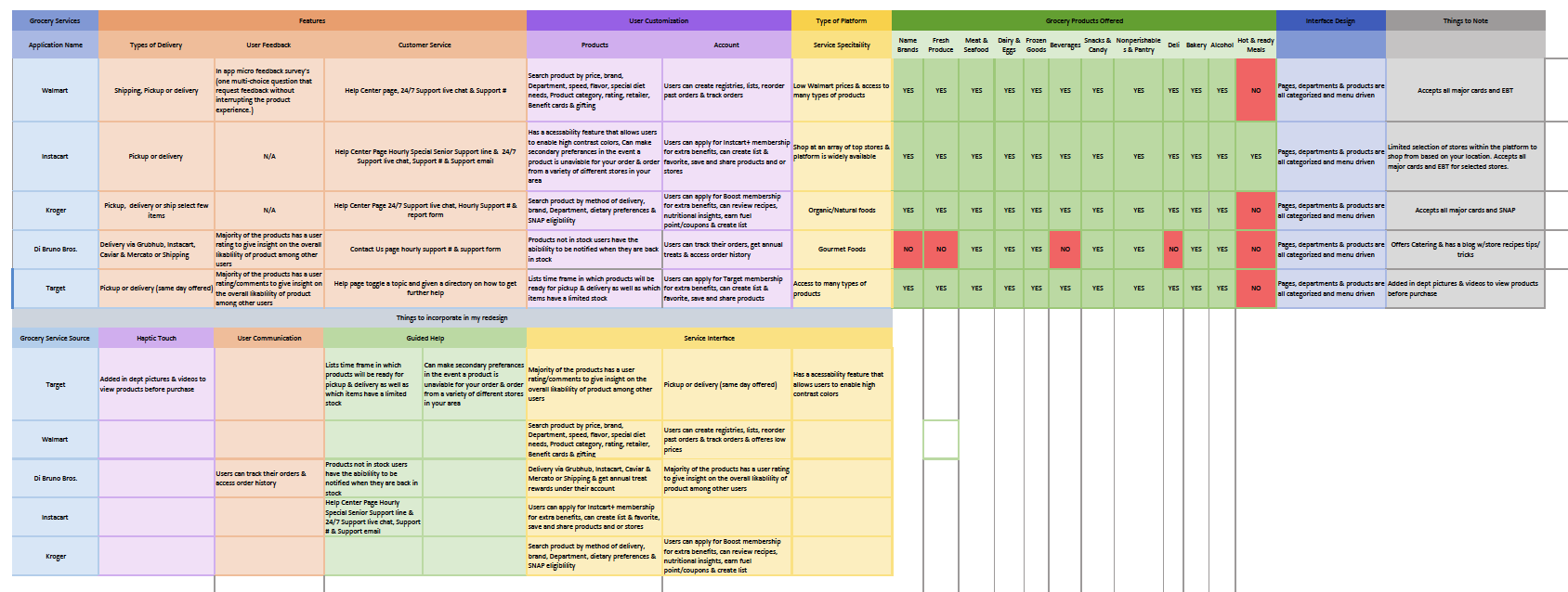 Implementing the design recommendations from my research I developed a wireframe prototype of a grocery service application. I also completed a competitive analysis to further highlight and incorporate competitor features into my application for improvement.