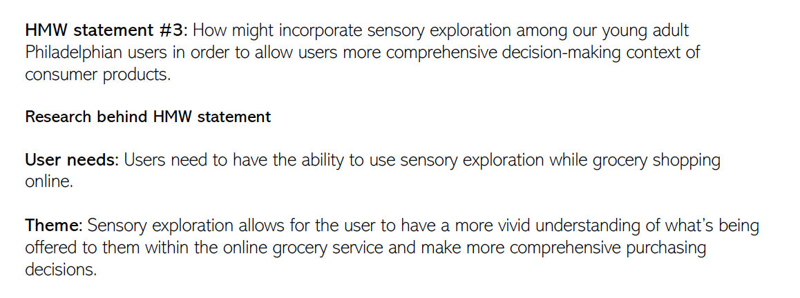 From both the primary and secondary research, I was able to find consistent themes for online grocery services. There are user needs that are inhibiting positive service interaction and navigation. By addressing those needs, I would be able to start improving overall experiential enjoyment with online services. Those needs have been put into a Point of View (POV) format.