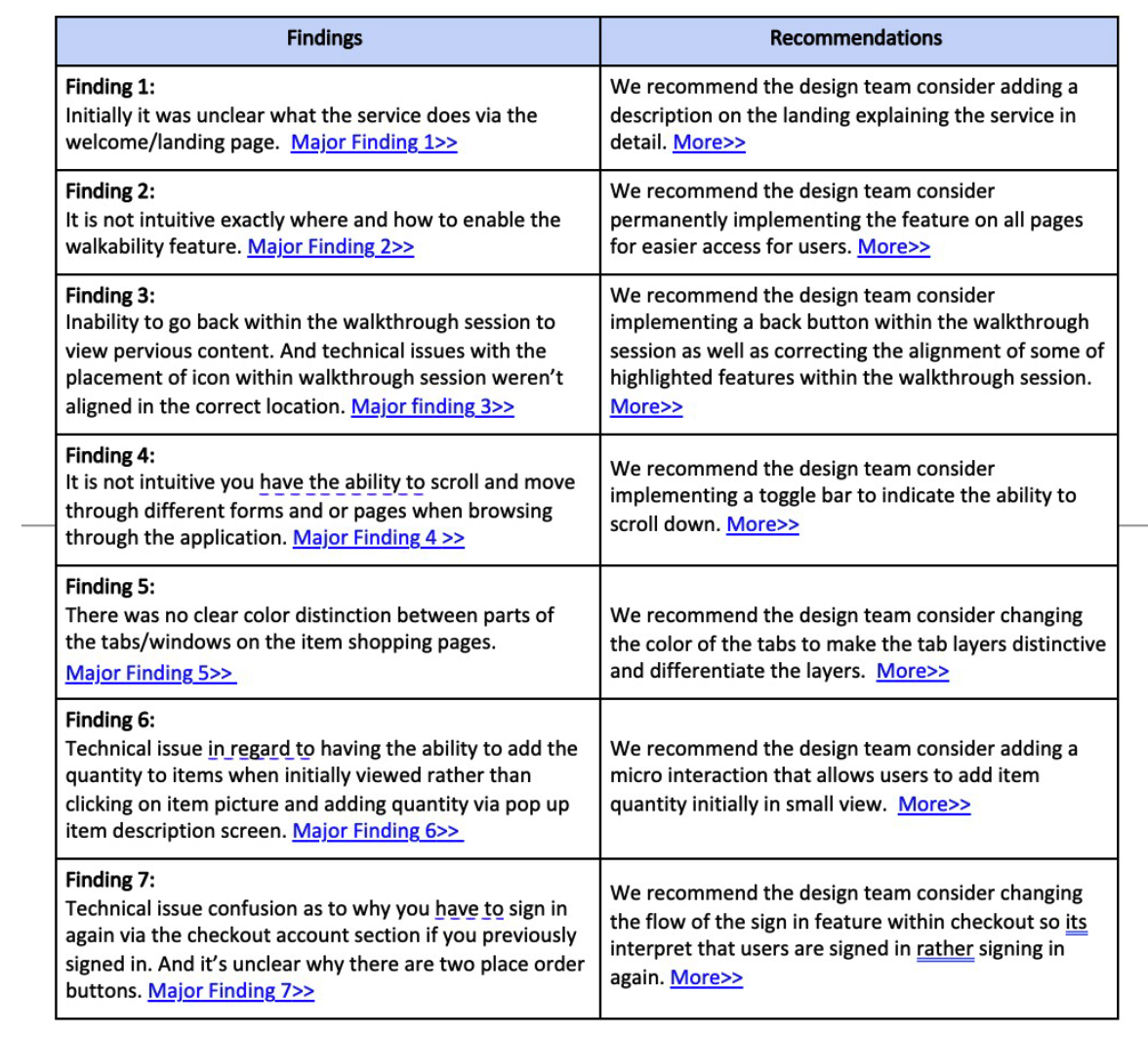 Identify the userās overall experience, pain points and functionality/usability of your designed recommendations to further understand any implications it has as a user experiences them.