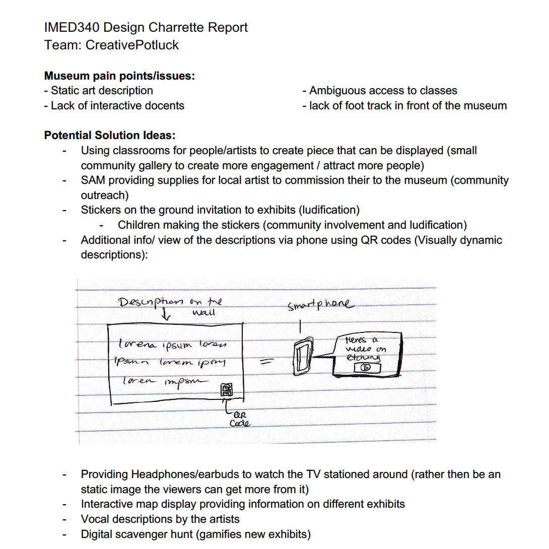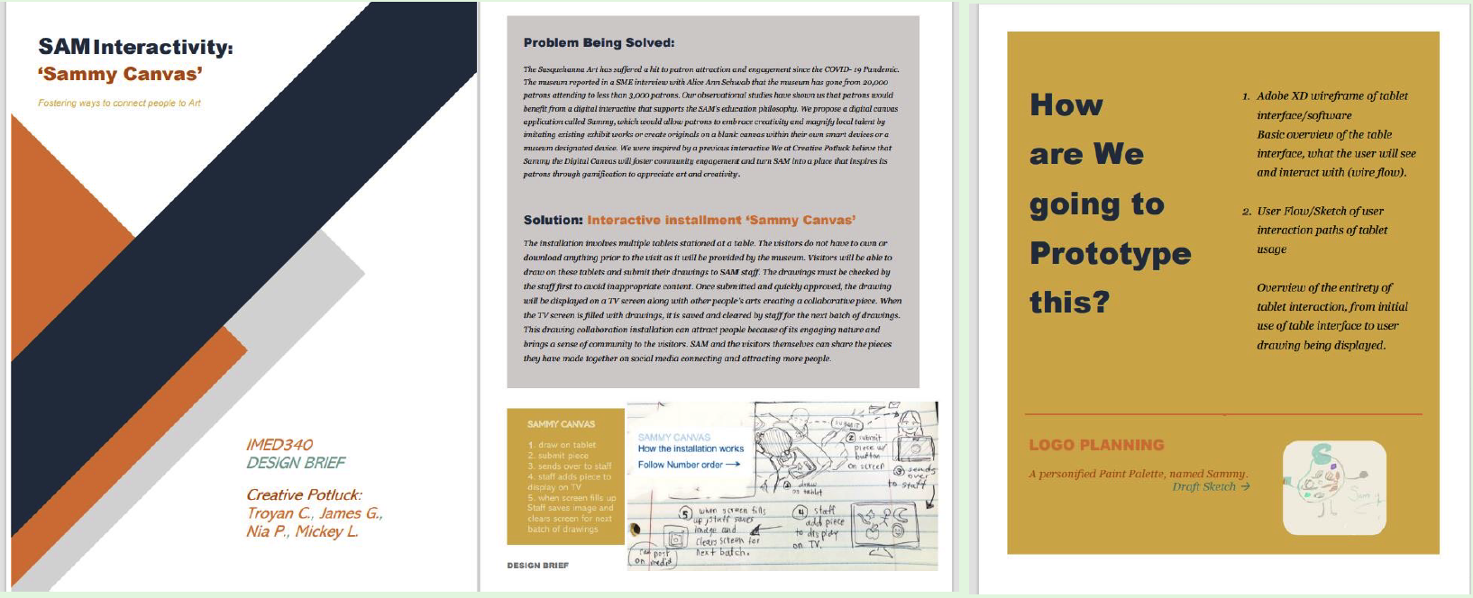 This project was a great start at establishing the museum’s and patrons needs and pain points. The Sammy application was designed to not only increase patron engagement but also help spread/hone creativity and art appreciation. This project was a awesome experience for me working with a diverse team (from different fields/expertise), collaborating methods/ideas and organizing tasks and time effectively. I found this experience to be challenging yet reflective in the way I approach design solutions and ideation. I was able to be experimental in my methods with different design sprint exercises. I often have a linear outlook in cultivating solution so the design sprints really helped to open my mind and align my approach within my problem space.