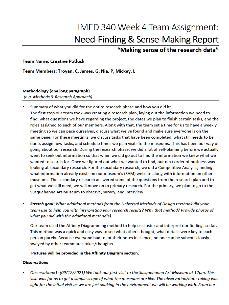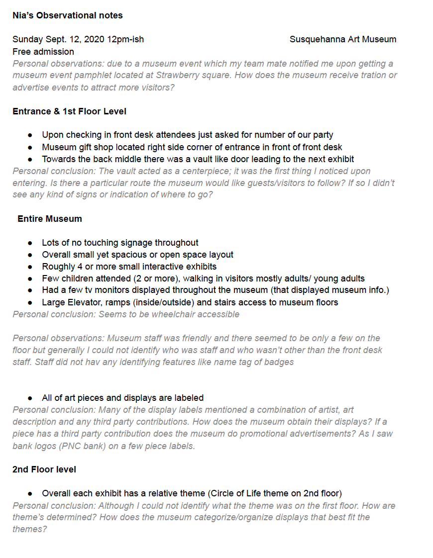 We took various visits to the Susquehanna Art Museum. The visit was for us to get a simple scope of the museum. The observation/note-taking was to soak in the environment and gather data on the museum patron experience.