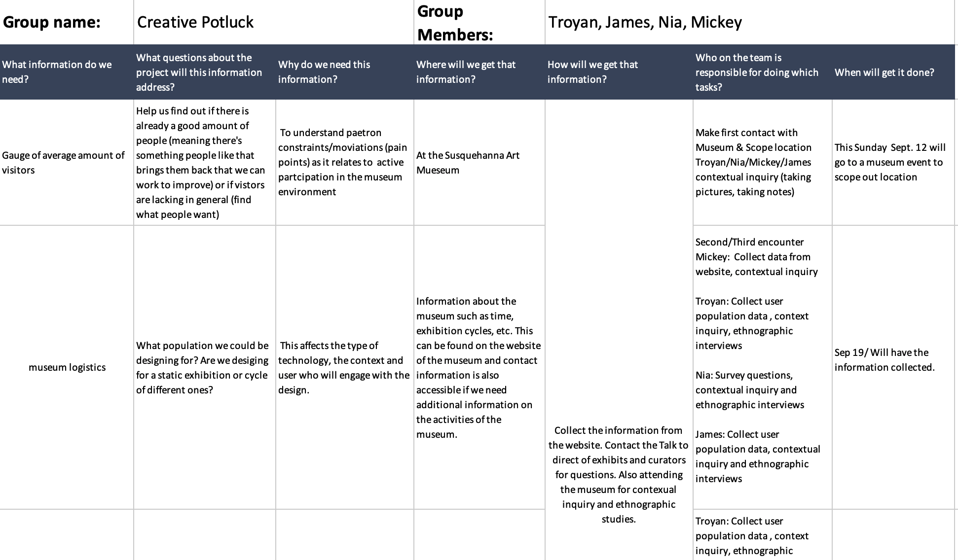 Established a detailed itinerary/plan for our research/scope and delegated team roles. Within the plan we determined we needed to learn more about: