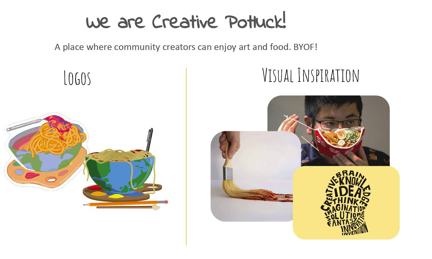A fun team building exercise to get better acquainted with our team members. We established our team name Creative Potluck and designed a team logo.