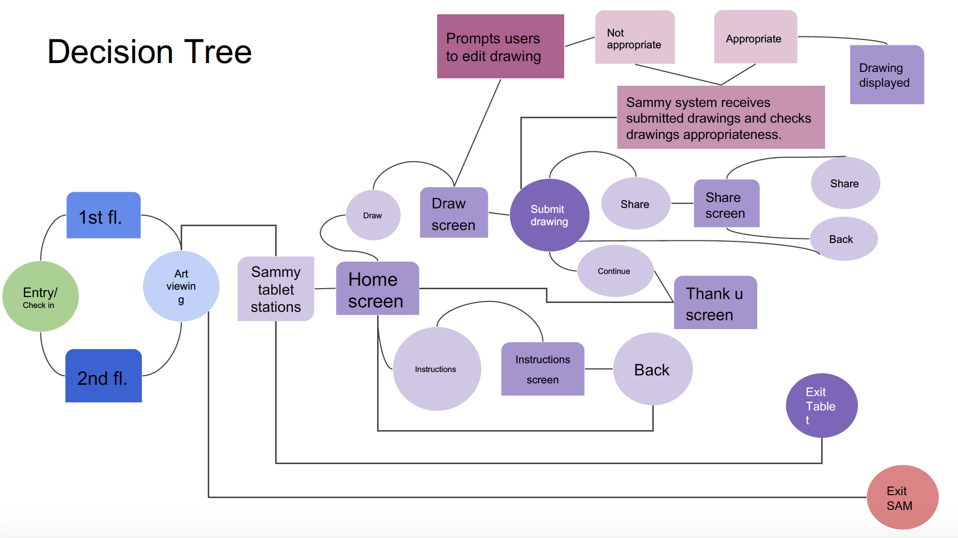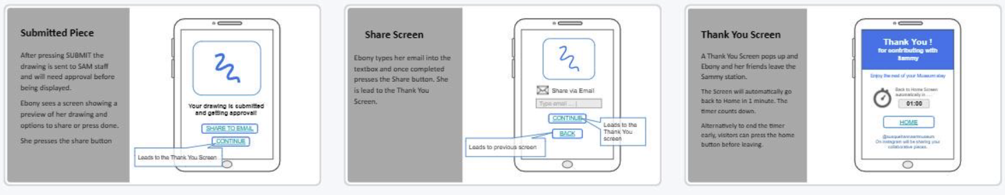 Due to the limited time frame for the project completion our team would still need to establish a round of usability/functionality testing once the application is approved by SAM (). This would help with understanding the apps functionality/compatibility with patrons. As well as identify any other mesum logistics that come up during app installation, art curation themes etc. And finally, cultivating our high fi prototype (wireframe) into a fully functional application for the official introduction of the app to patrons and museum installation.